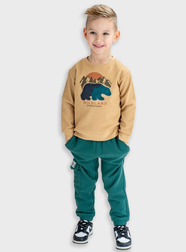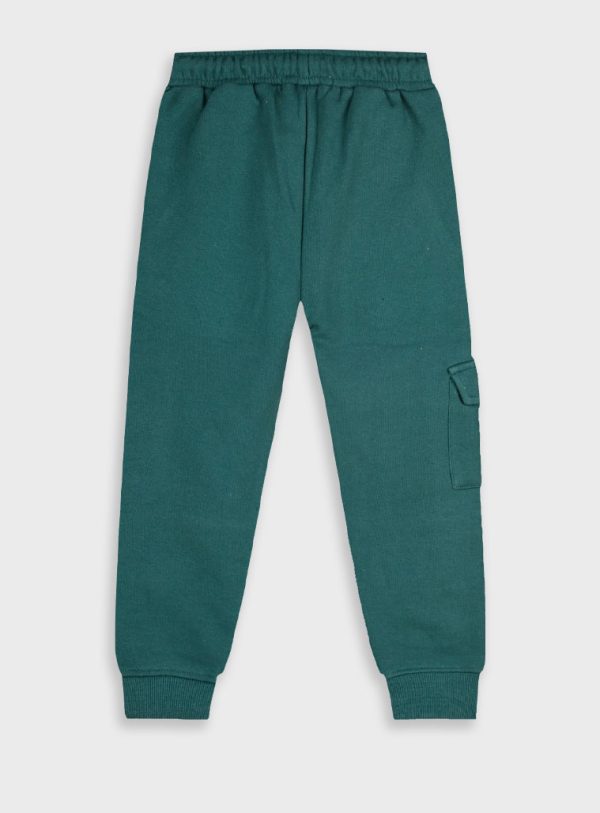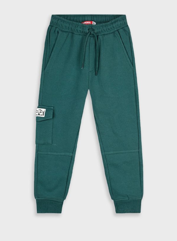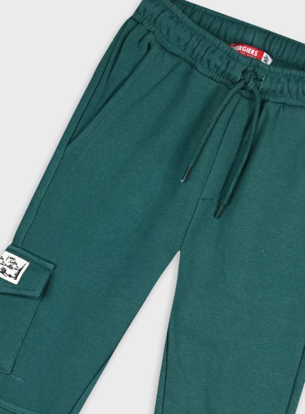 Calças desportivas para menino. Apresentada em verde. Ajusta na cintura com cordão e elástico. Tem ajuste no tornozelo. Bolso tipo cargo no joelho. Tem costura nas pernas para dar um look mais engraçado.