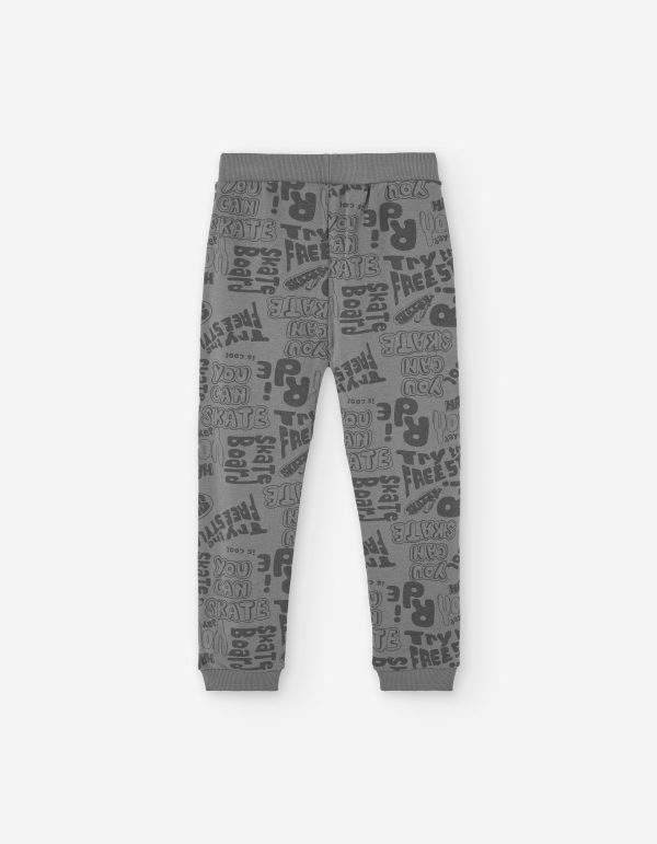 Calças desportivas para menino. Em cor cinza com padrão de texto em antracite. Ajustadas no tornozelo e apertam com cordão na cintura.