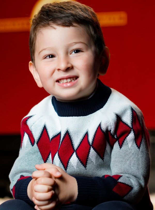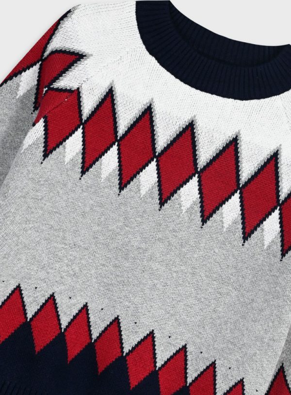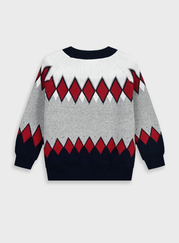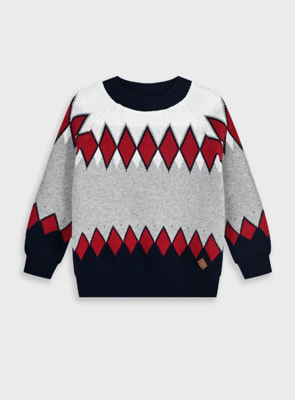 Camisola de malha para menino. A malha faz bonitos losangos em vermelho, que se conjugam muito bem com as cores do restante padrão, cru, cinza e azul escuro.