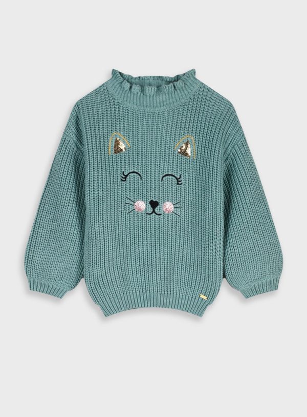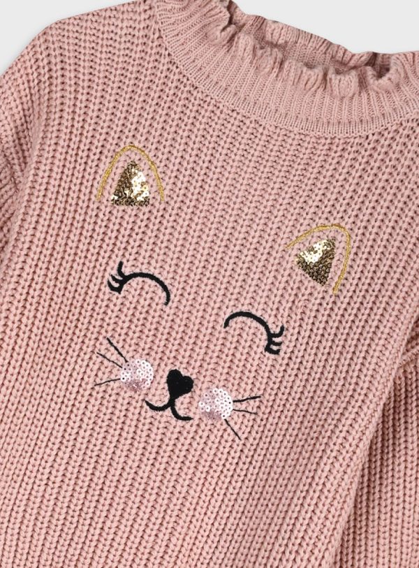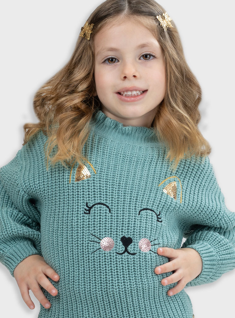 Camisola de malha para menina. Tem bordado de gato na frente, onde foram adicionadas lantejoulas. Disponível em verde e em rosa. Faz conjunto com calças folgadas rosa.
