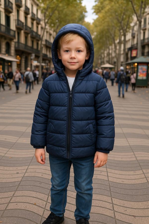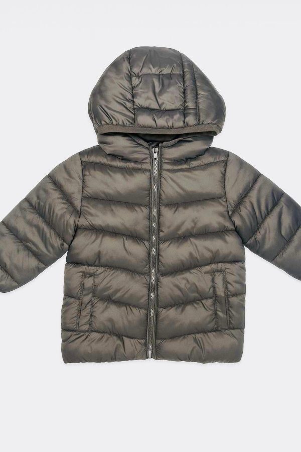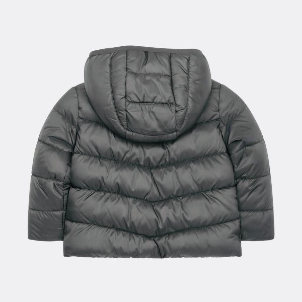 Casaco acolchoado com capuz para menino. Fecha com zip. Ideal para os dias frios. Disponivel em três cores. Tem bolsos interiores frontais e punho ajustado.