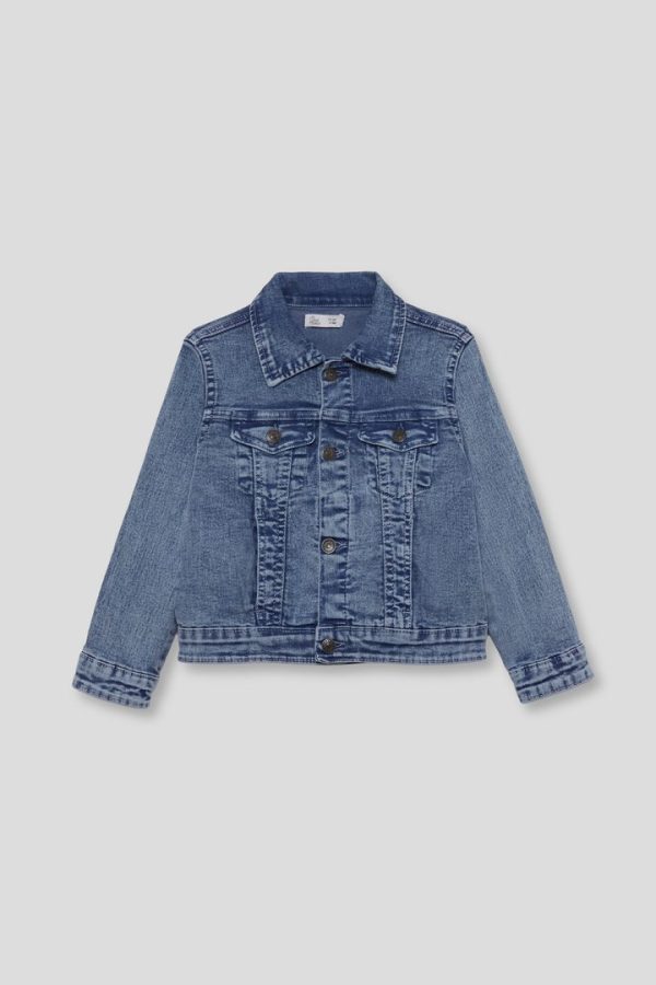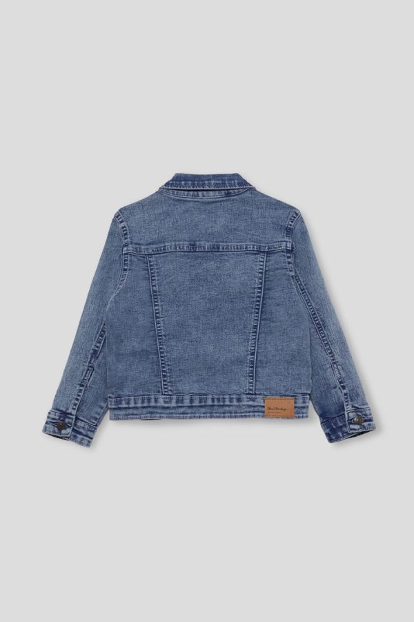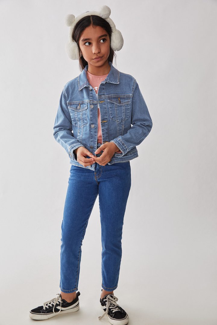 Casaco ganga para menina de 2 anos a 16 anosem azul denim com colarinho de camisa e manga longa. Fecho de botão na frente. Bolso no peito com fecho de botão.