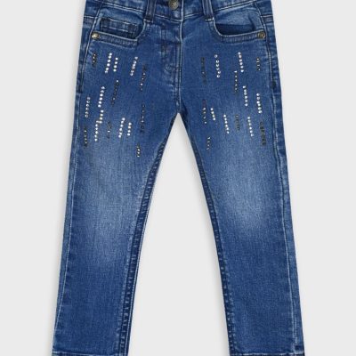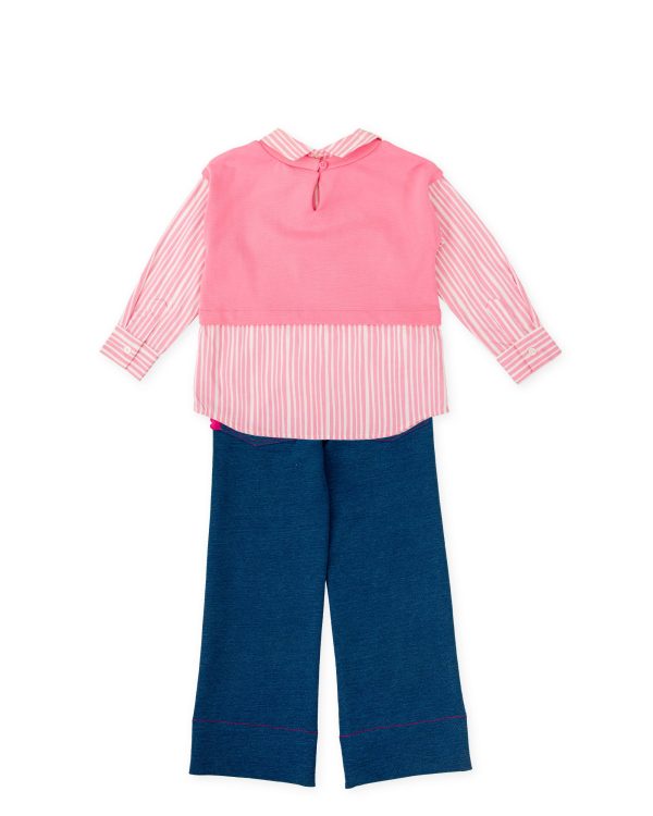 Conjunto de duas peças com camisa e jeggings. A camisa tem colete incorporado rosa com corações e estrelas, que condizem com as riscas da camisa. As calças são jeggins confortáveis que possibilitam a brincadeira das mais pequenas.