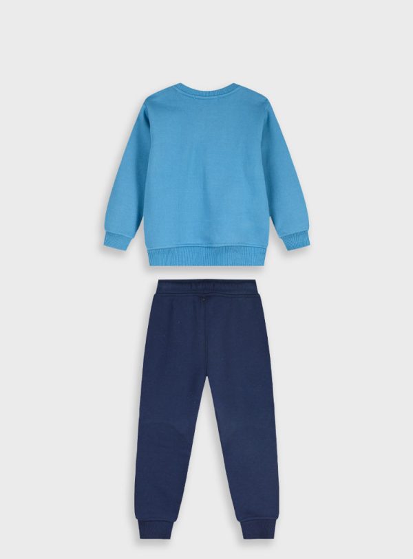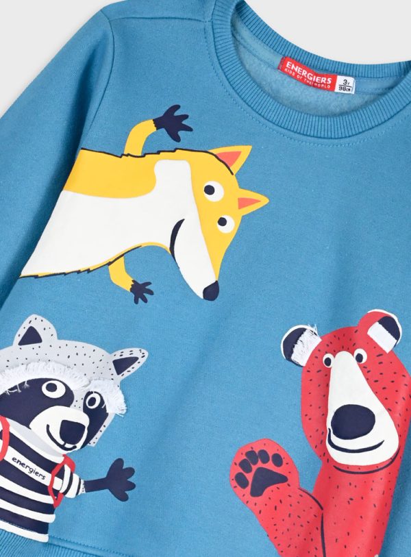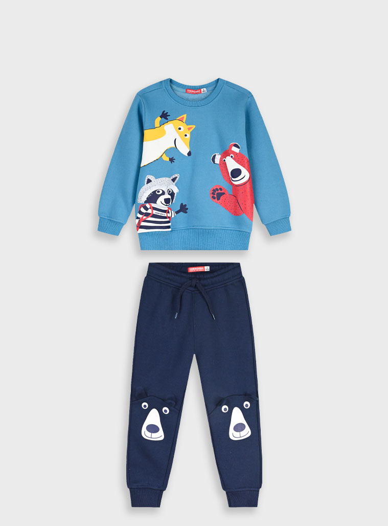 Fato de treino animais para menino. Camisola fechada, com gola redonda. Tem animais impressos na camisola e nos joelhos. Calças apertam com elástico e cordão. Tem tornozelo ajustado. Em tons de azul.