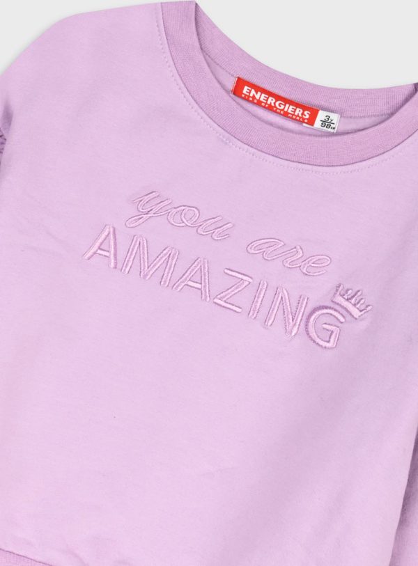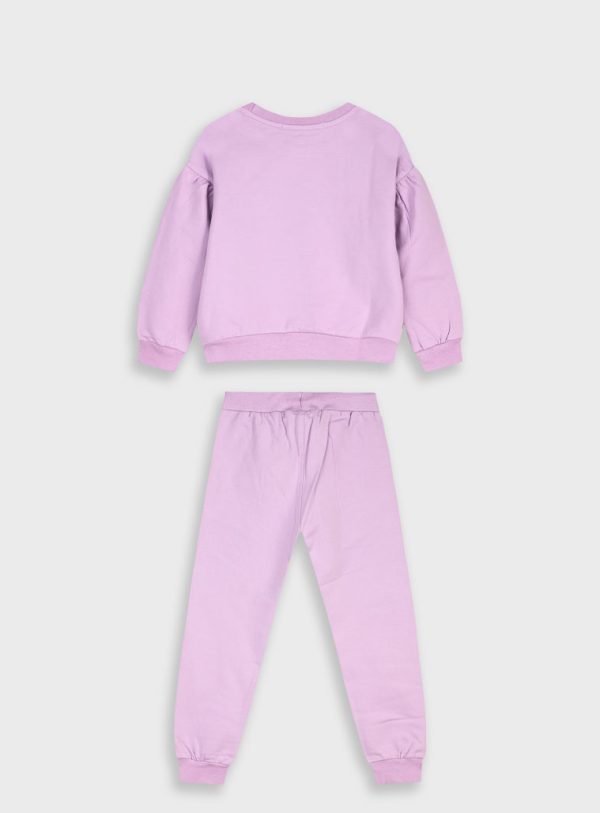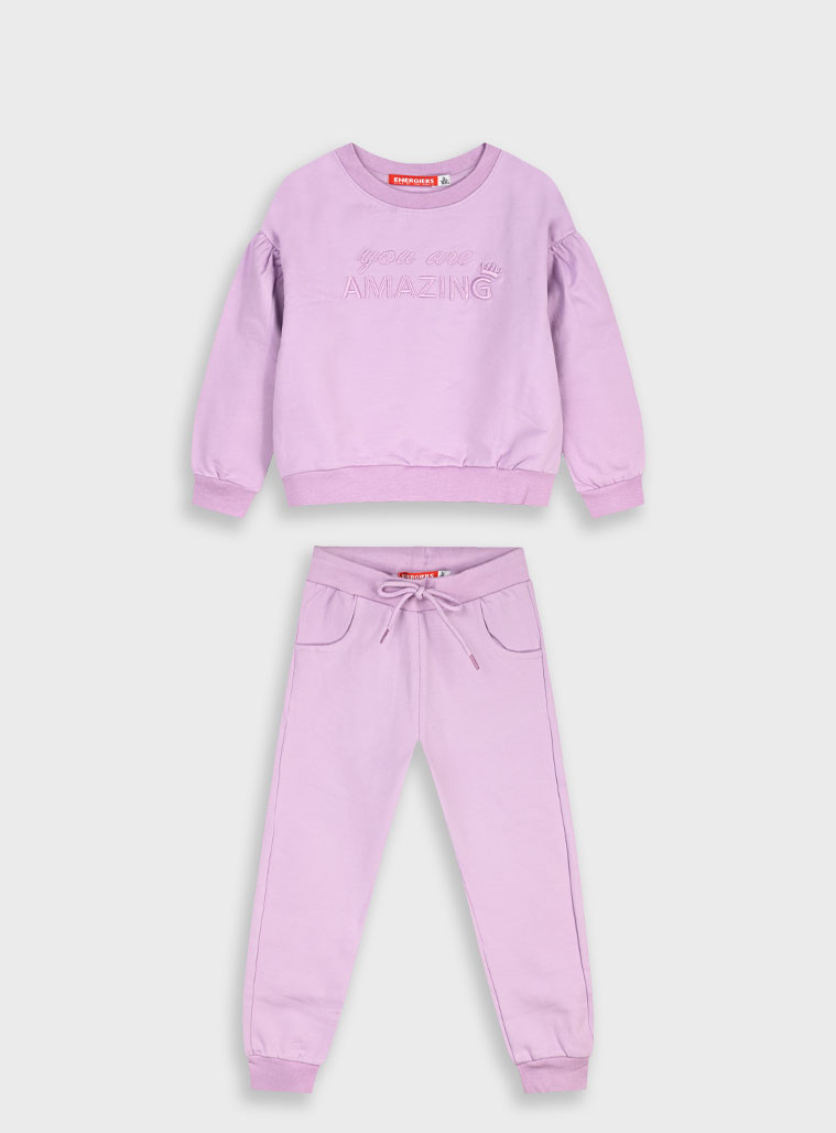 Fato de treino para menina. Tem camisola bordada, com gola redonda. Punho e cintura ajustadas. O ombro é descaido e tem pequenas pregas. Calça ajustada no tornozelo, aperta com cordão na cintura. Em cor lilás muito feminino.