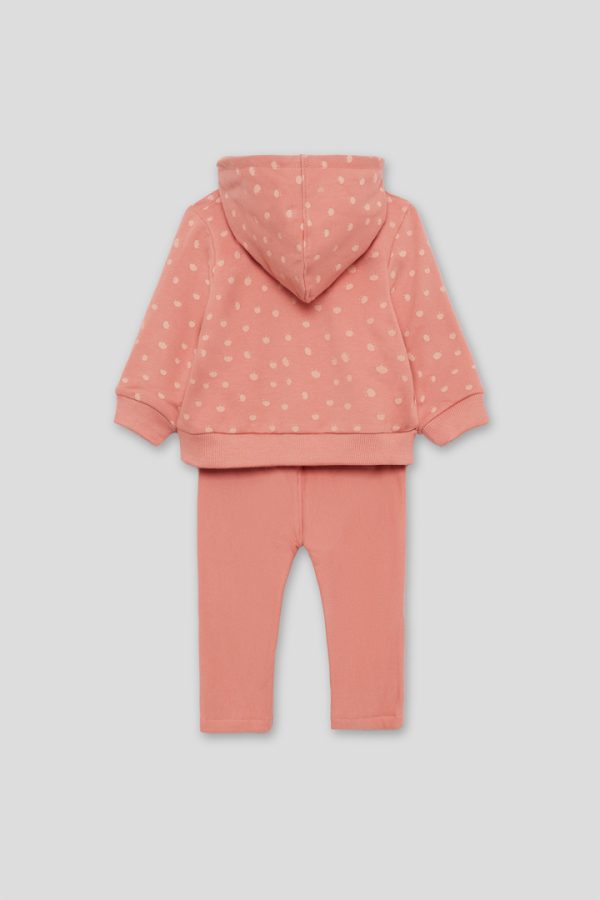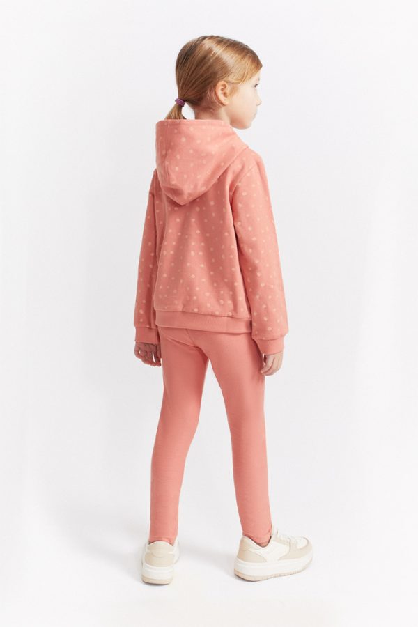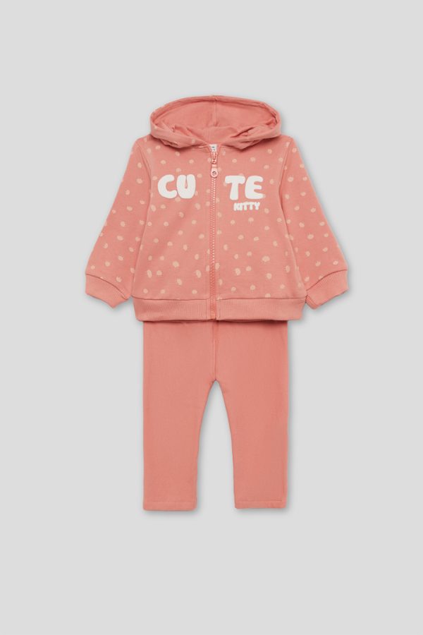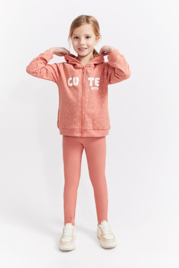 Conjunto de duas peças, sweat com zip e leggings para menina. Sweat com capuz em cor com bolinhas e texto “CUTE KITTY” na parte da frente com detalhes em relevo. Tem zip central e acabamentos em canelado nas mangas e na parte inferior para maior conforto. Combina com leggings lisos a condizer, com cintura elástica que garante um ajuste confortável durante todo o dia. Confeccionado em felpa suave e quentinha, ideal para os meses frios.