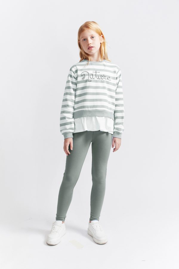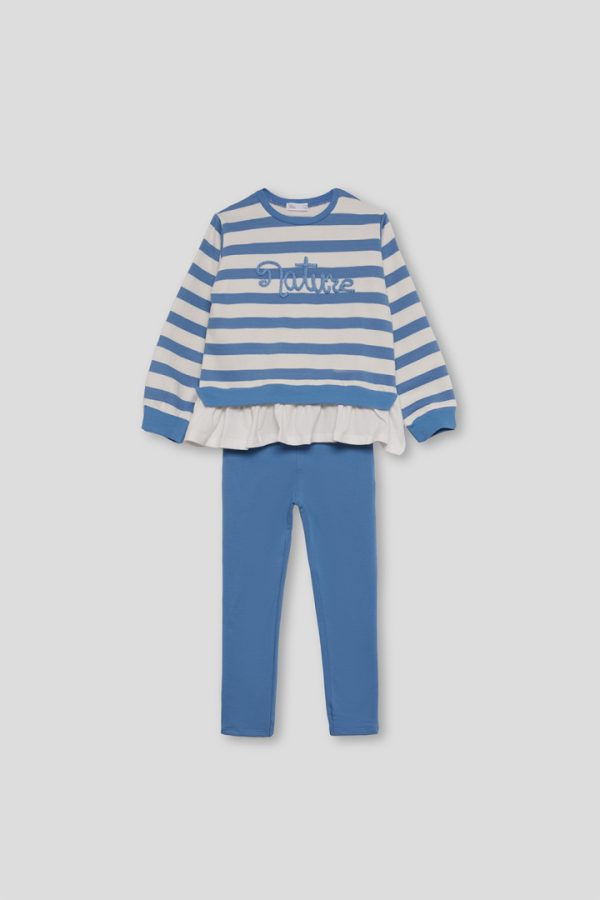 Conjunto de duas peças, sweat e leggings para menina. Sweat de manga longa com design de riscas horizontais e detalhe na parte inferior com volante branco tipo blusa. Apresenta gola redonda em contraste e texto “Nature” bordado no peito com textura. Leggings a condizer em malha elástica lisa, com cintura confortável e ajuste justo. Um conjunto cómodo, doce e com um toque original, perfeito para o dia a dia das mais pequenas.