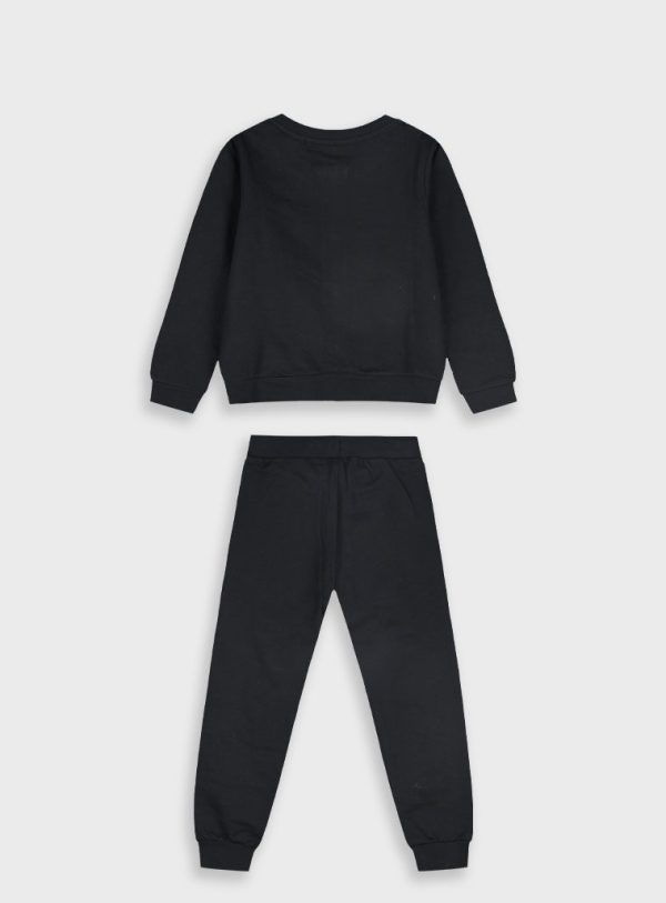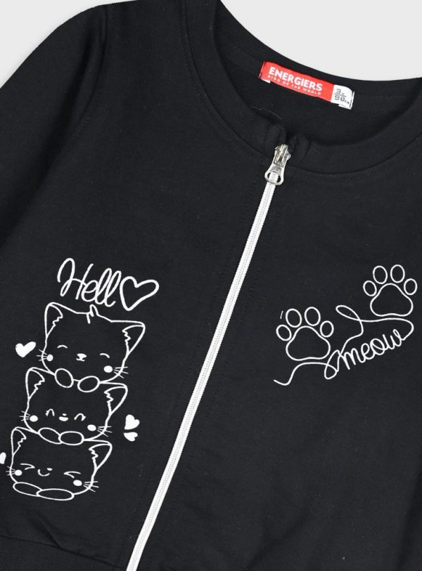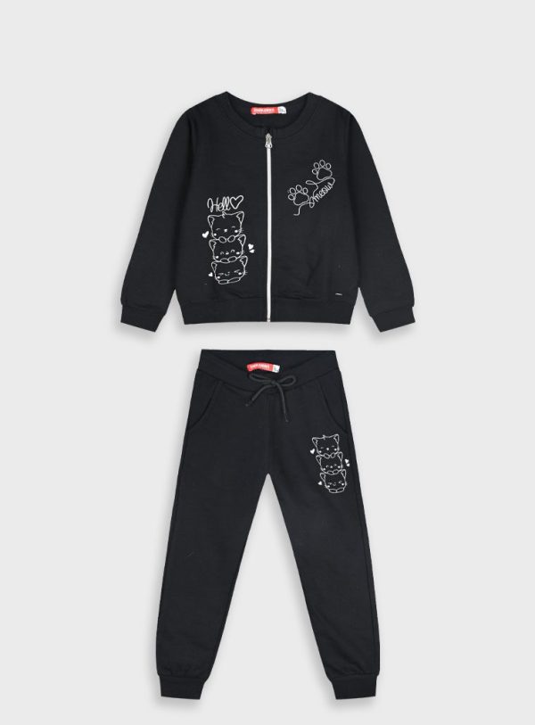 Fato de treino para menina. Apresentado em preto, com desenho de gatos na frente, no casaco e nas calças. Casaco tem gola redonda e aperta com zip. Punhos e cintura ajustados. Calças ajustadas no tornozelo, apertam na cintura com cordão.