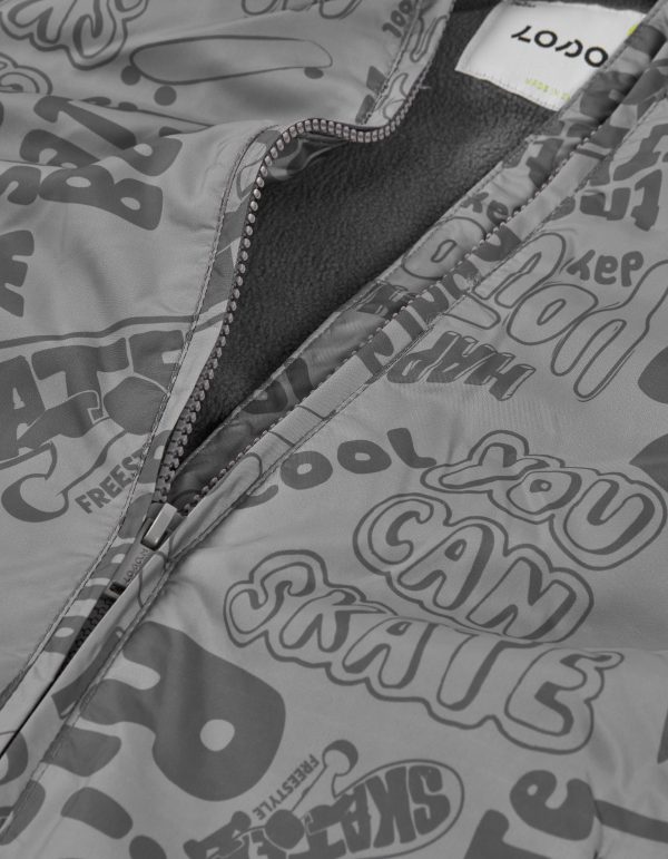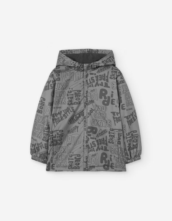 Parka leve para menino. Tem forro em polar para ser mais confortável quando os dias começam a arrefecer. Tem padrão com letras. O capuz e o fecho com zip tornam a peça versátil e aconchegante.