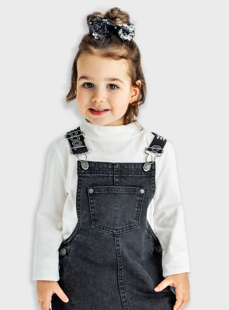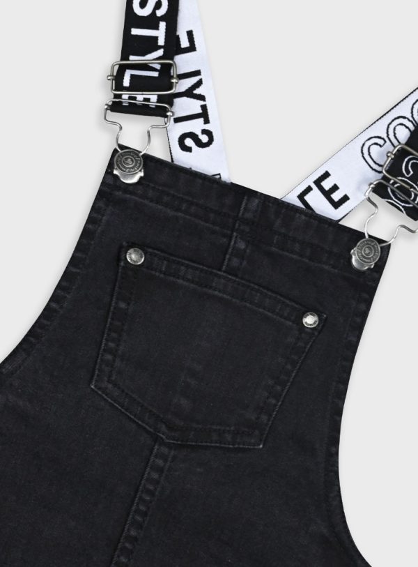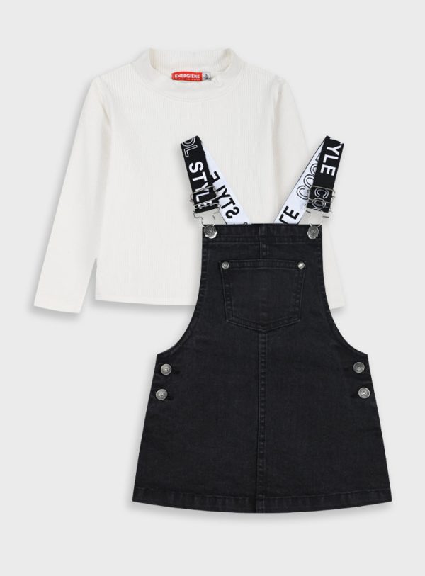 Saia de peito preta. Tem alças em elástico com palavras em preto e branco. Aperta com botões. Vem como conjuto com a t-shirt branca de meia com que é apresentada.