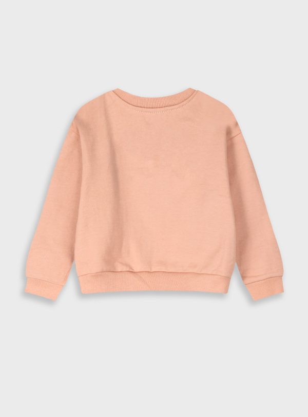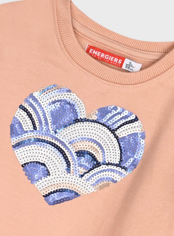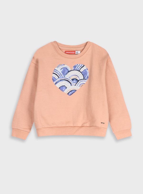 Sweatshirt fechada bege para menina. Tem coração bordado com lantejoulas na frente. Gola redonda, punhos e cintura ajustados. Pode fazer conjunto com as calças de ganga azuis com brilhantes.