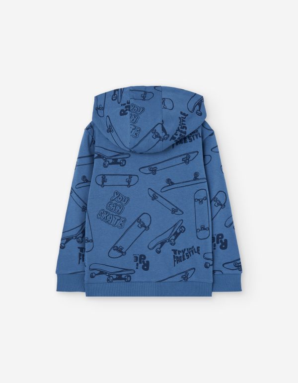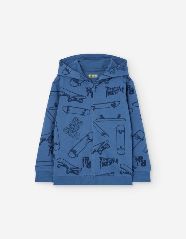 Sweatshirt com capuz para menino. Fecha com zip. Tem padrão com skates e texto. Punho e cintura ajustados.