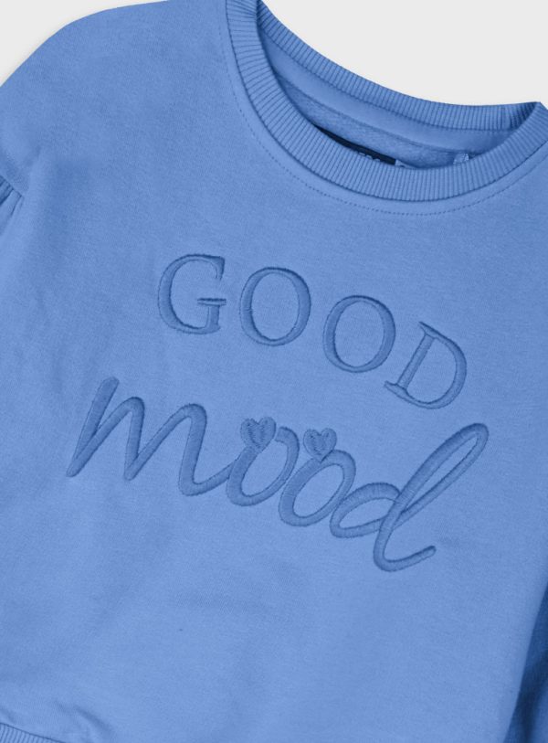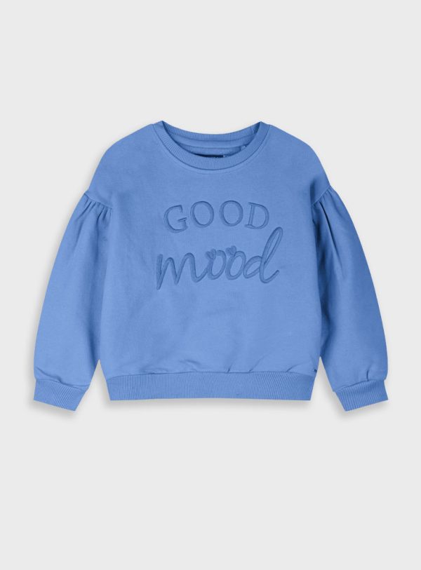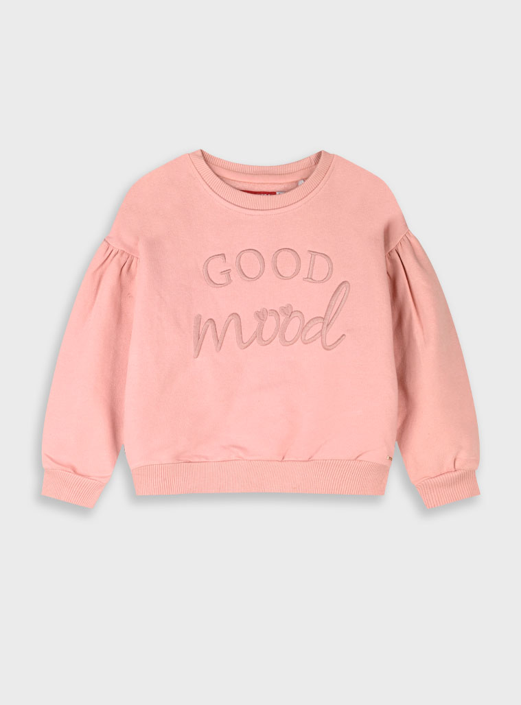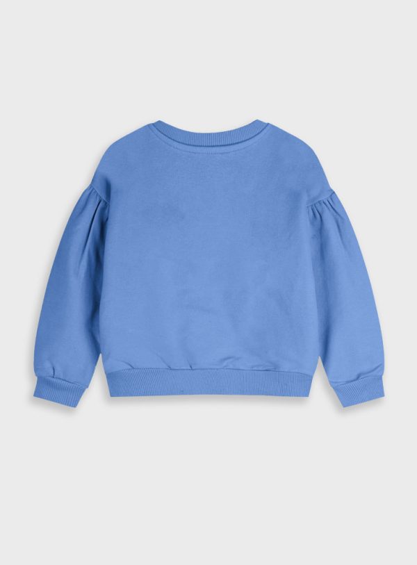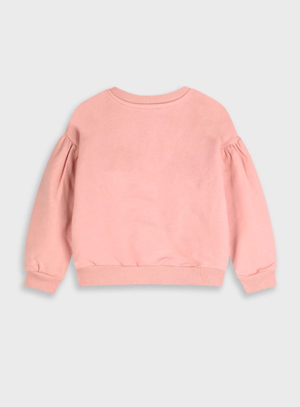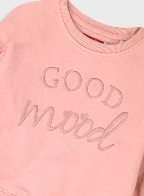 Sweatshirt fechada rosa para menina. Tem ombros descaidos com pregas. Gola redonda, punhos e cintura ajustados. Tem bordado na frente. Apresentada em duas cores rosa e azul.