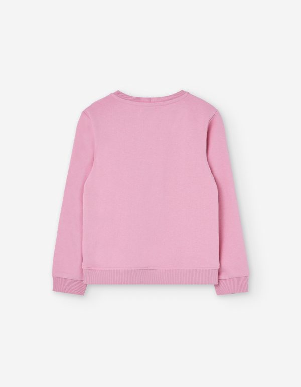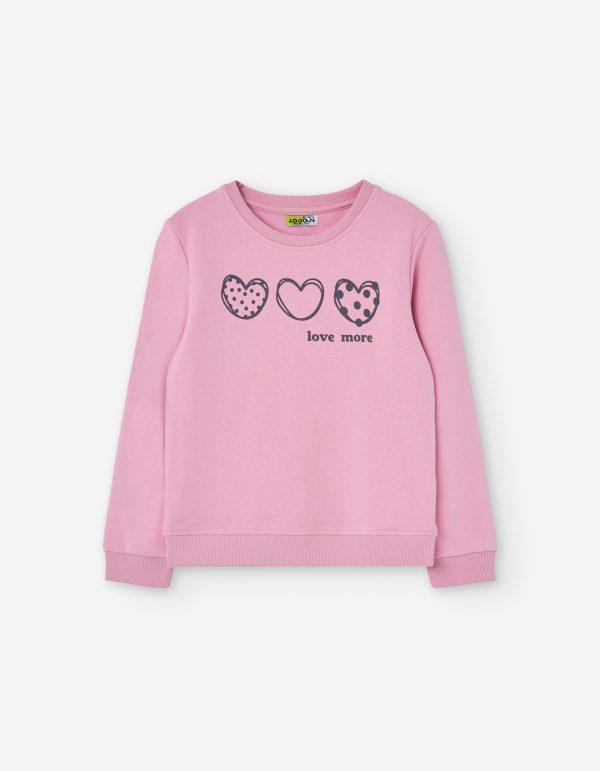 Sweatshirt fechada para menina. Coleção corações. Em tom rosa, com gola redonda, ajustada nos punhos e cintura. Tem corações impressos na frente. Pode ser conjugada com restantes peças da mesma coleção ou com leggings ou calças numa das cores disponíveis.