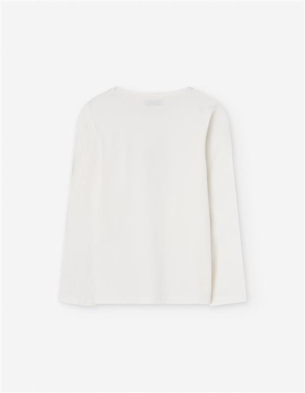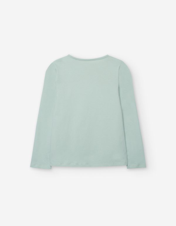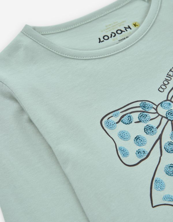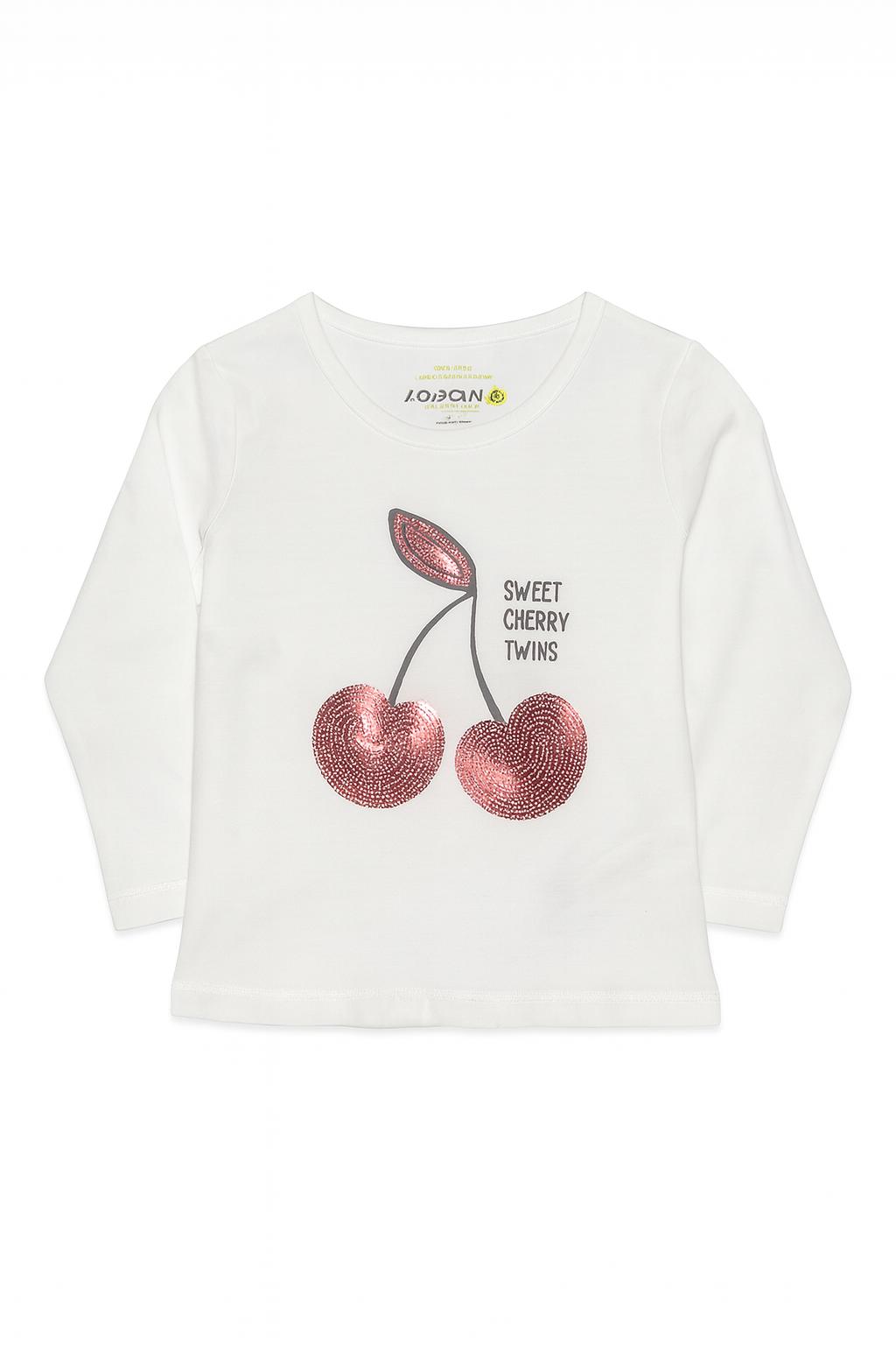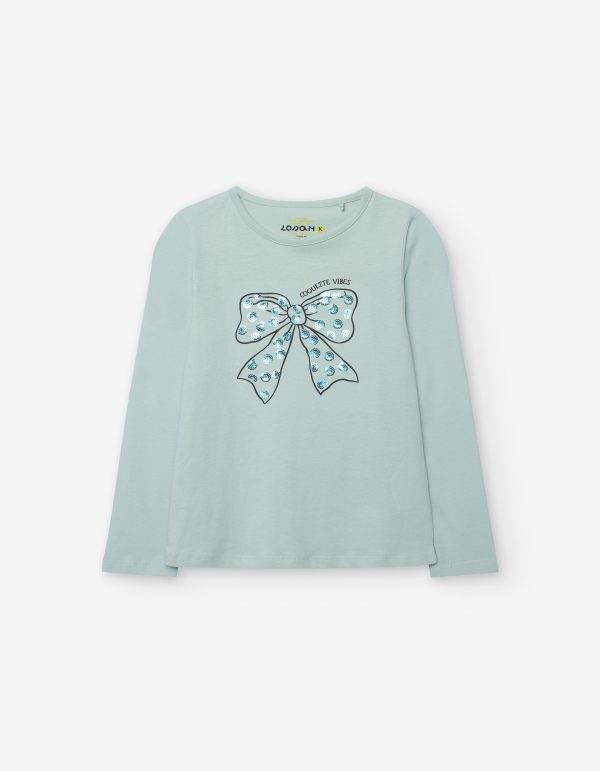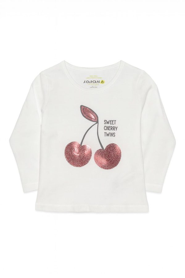 t-shirt de manga comprida para menina. Apresentada em duas opções bordadas com lantejoulas. Branca com cerejas ou verde com laço.